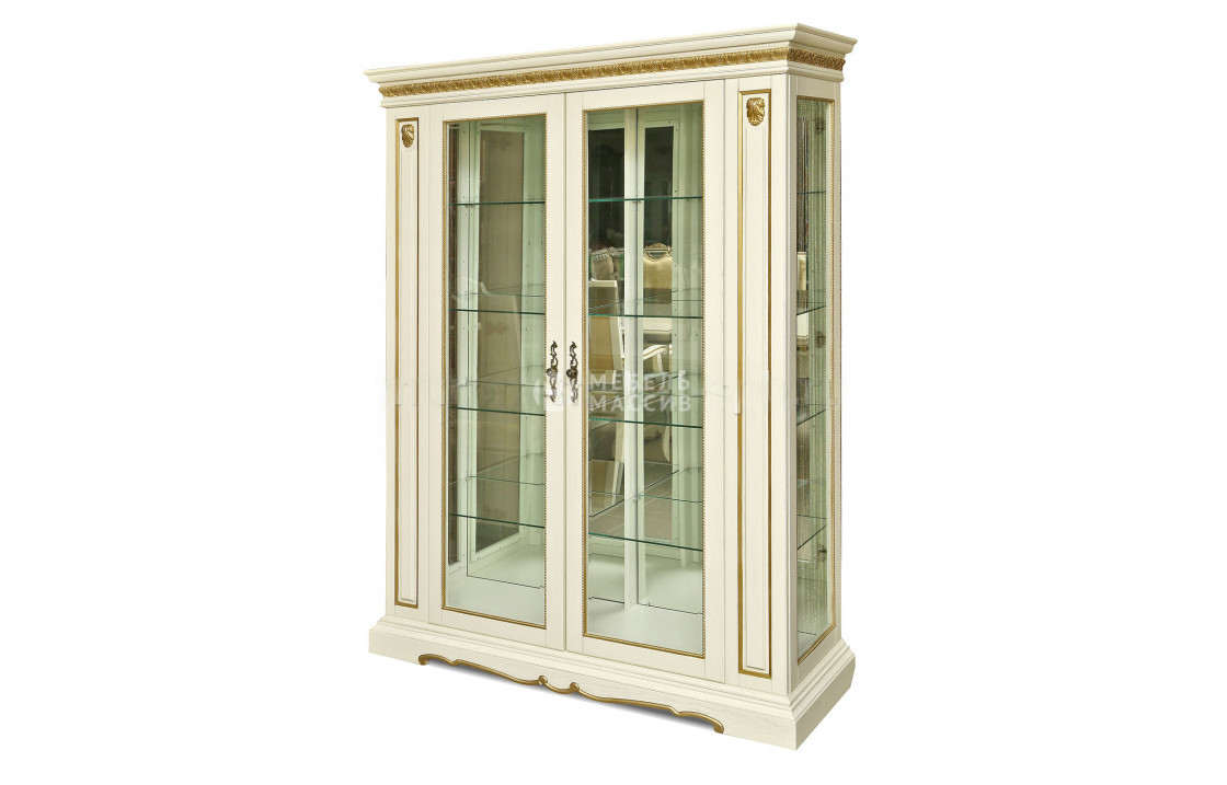 Двустворчатый сервант Милано подойдет для хранения посуды, предметов декора, фоторамок. Он имеет стеклянные полки, зеркало на задней стенке, застекленные дверцы и боковые панели. Дизайн модели типичен для своей линейки: тут есть резные узоры в верхней части, классического вида карниз, изогнутый элемент на поддоне. Основным материалом изготовления служит натуральная древесина, превосходно справляющаяся с нагрузками. Стандартный цвет серванта кремовый с золотыми вставками, но его можно поменять при совершении заказа.| Размер | Цена | |