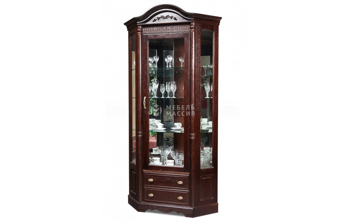 Скошенный сервант Валео - небольшой предмет мебели, сочетающий в себе необычный внешний вид и хорошую функциональность. Дизайн изделия выдержан в классическом стиле. Основным отличительным элементом является застекленная створка, занимающая большую часть фасада. Внутреннее пространство за стеклом отведено под полки, куда можно поместить небольшие растения, элитную посуду и коллекционные предметы. Также модель оборудована четырьмя выдвижными ящиками для скрытного содержания вещей. Внешний вид мебели сразу бросается в глаза. Высокий фронтон украшен цветочной инкрустацией, присутствует и резьба на деревянных элементах. Остаётся только выбрать цвет мебели и подходящую фурнитуру. Доставка по Кисловодску и Ставропольскому краю .| Размер | Цена | |